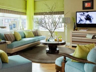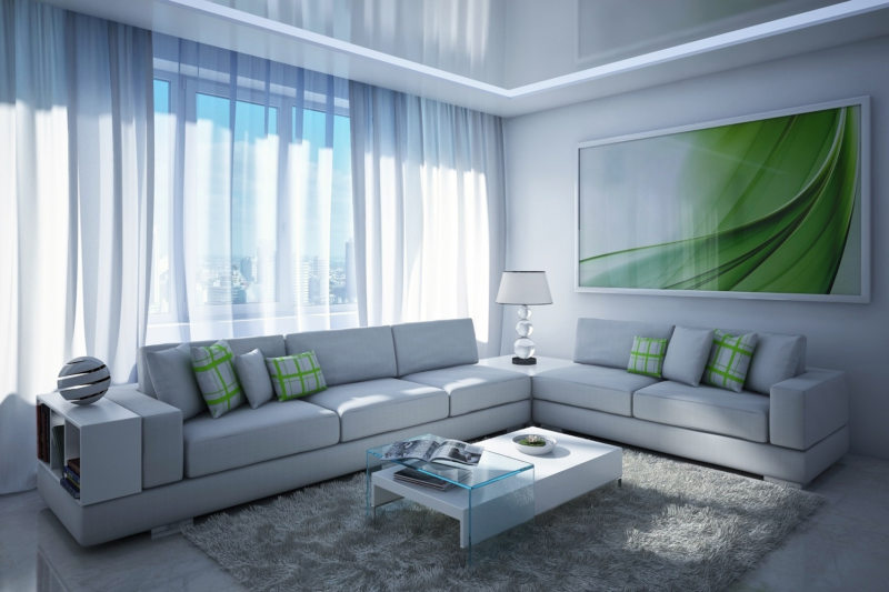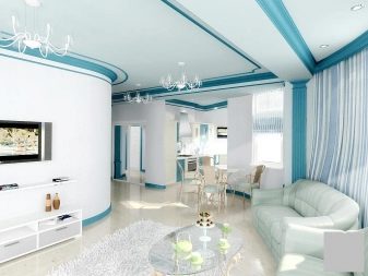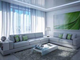 The ceiling should be combined with the general interior. Choose a white shade. It will definitely be a win-win option. Bright living room furniture in shades of blue will be the ideal solution if the main color is bright. Pay attention to the turquoise, milky, blue shades. Furniture in such colors will be in harmony with the rest of the interior.