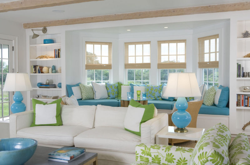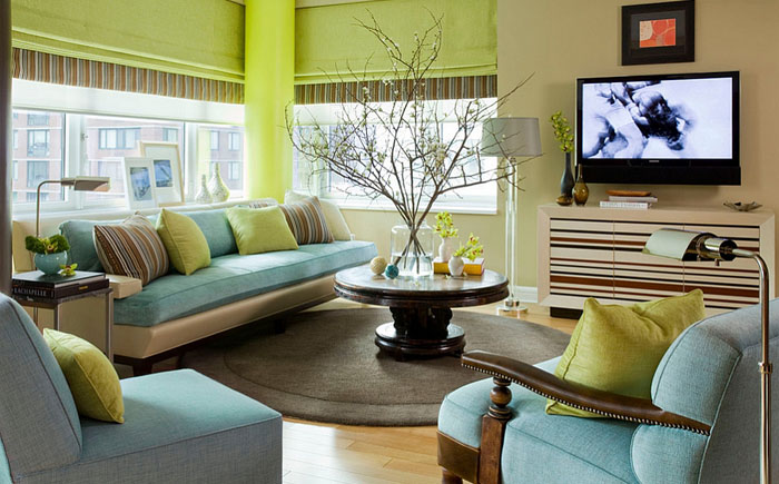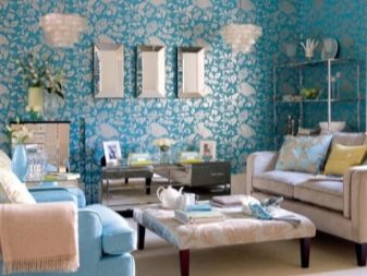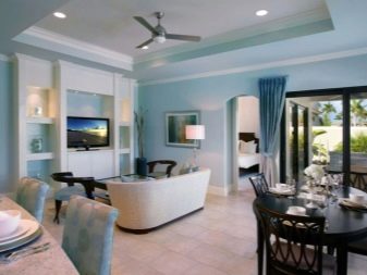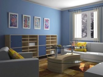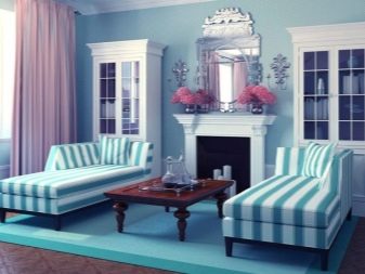 For bright blue shades of the living room, select light pastel-colored furniture; bright furniture is good for light blue walls. To the interior was not boring, dilute the blue and contrasting colors with cheerful colors.