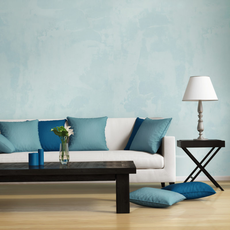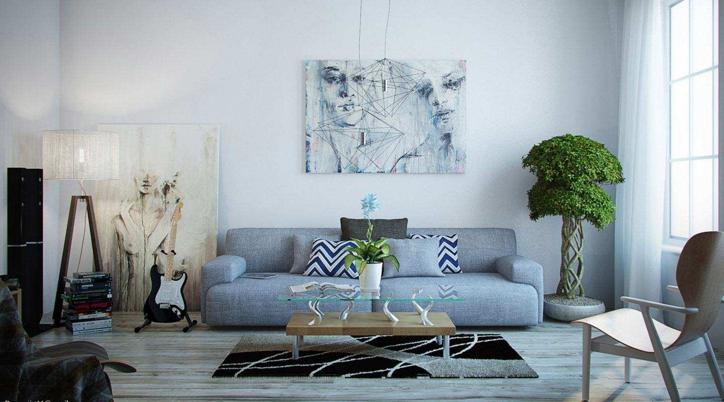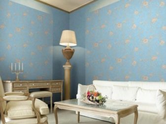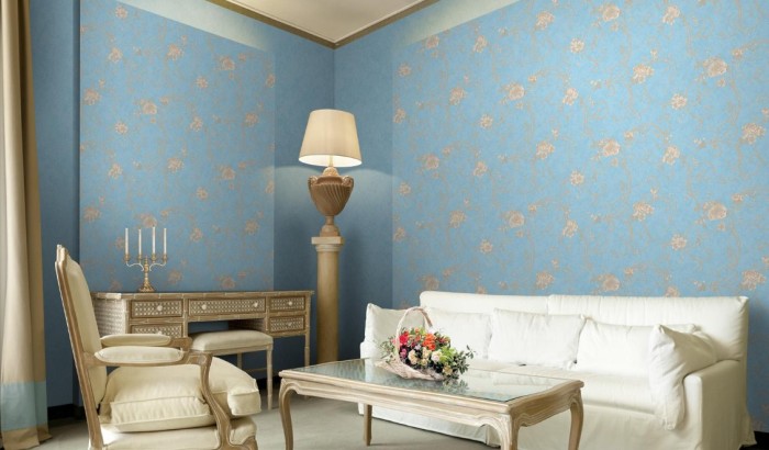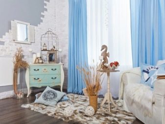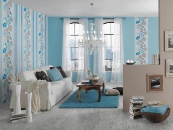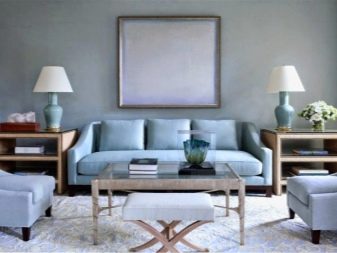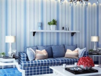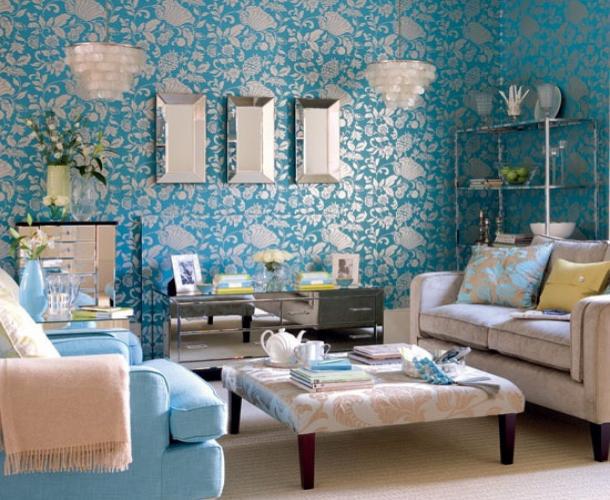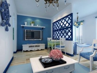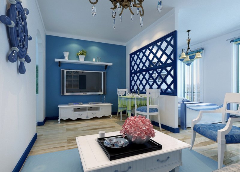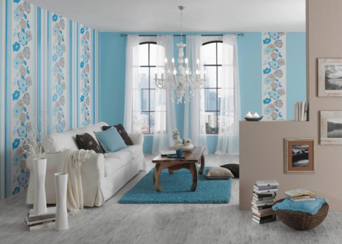 Begin with the design of the walls: it can be wallpaper or other material. Choose light blue shades to help you relax. Deep dark shades are suitable for spacious living rooms.Do not overdo it, otherwise you will turn a bright room into a gloomy and uncomfortable.
