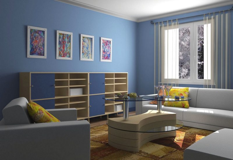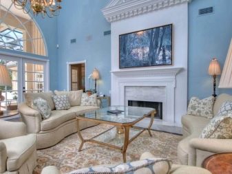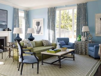 Blue is a heavenly hue with which hope is pinned. It calms, pacifies, gives strength when necessary. This color is suitable for decoration of living rooms. but not everything should be blue, interior objects must be combined with each other (furniture, wallpaper, additional decor).
