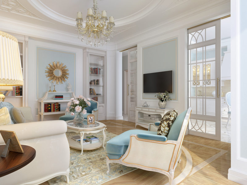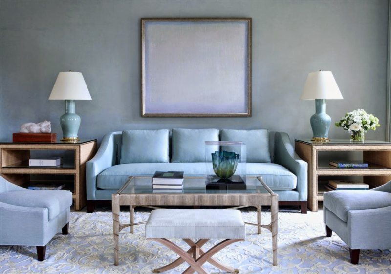 To make your living room look rich, stop at expensive natural furniture made of wood or leather. But there is an economy option. In this case, you need to choose furniture that fits exactly into your blue living room and will create an overall picture. Then no one will think about the price.