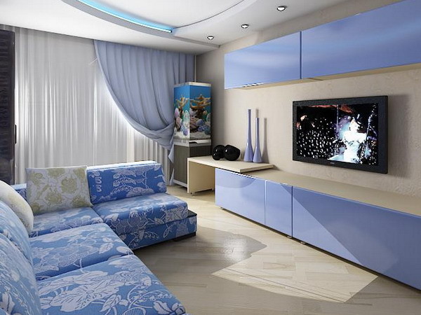 In any home there should be a space where you can get together in a big company, have fun, watch TV and have fun. Basically this place is a living room. Since it is the heart of the house, it should be cozy and beautiful. To do this, the living room can be decorated in blue.