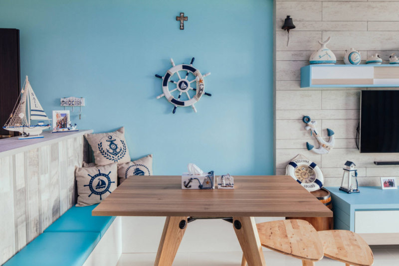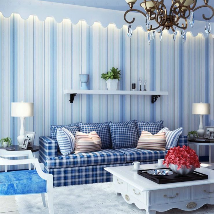- If you chose a marine theme for decorating the living room, it’s important to place the steering wheel on the wall, choose blue striped wallpaper.