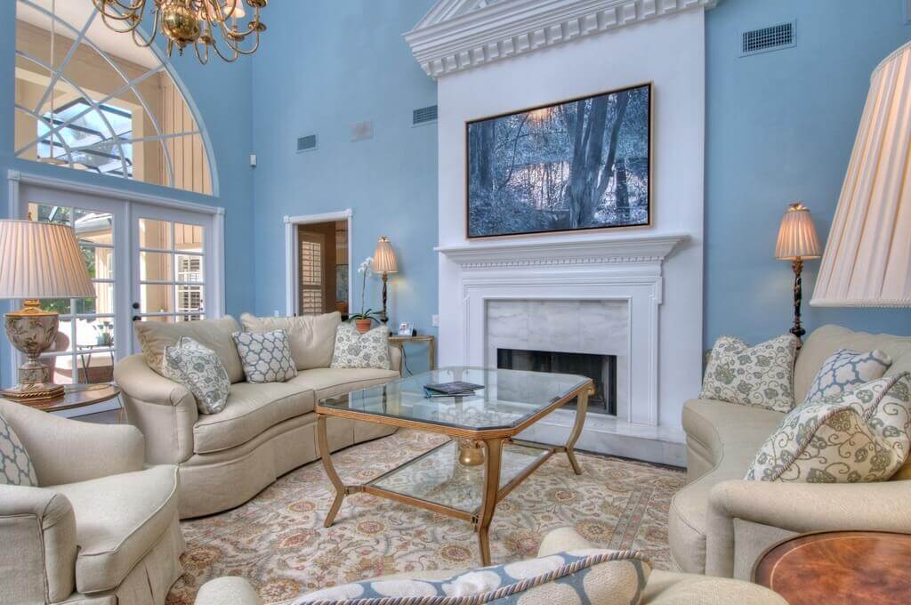 White furniture will highlight your blue walls, but you need the right care. If you have animals that can ruin furniture in seconds, it’s best to leave this idea behind. Focus on wooden furniture. If the white tone has already been chosen, you can purchase eurocovers: they will reliably protect the upholstery from the claws of pets and allow you to simplify the care of furniture. So you can put together a separate sofa and chairs, giving them the appearance of a single headset.