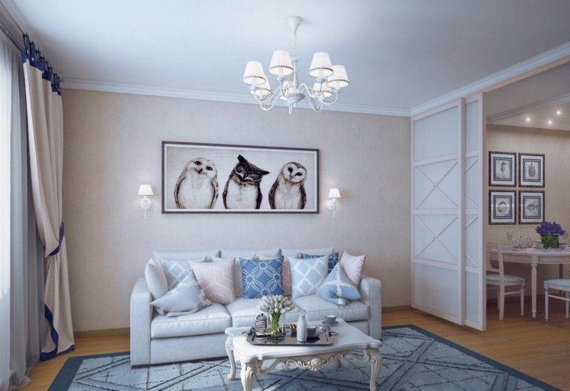 Color focus can be done on different things. For example, it is necessary to highlight the ceiling, make it blue, like the sky, or whiten it. Bleached ceiling will give the living room a feeling of cleanliness.