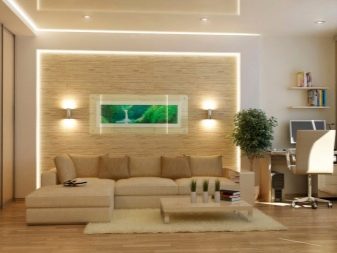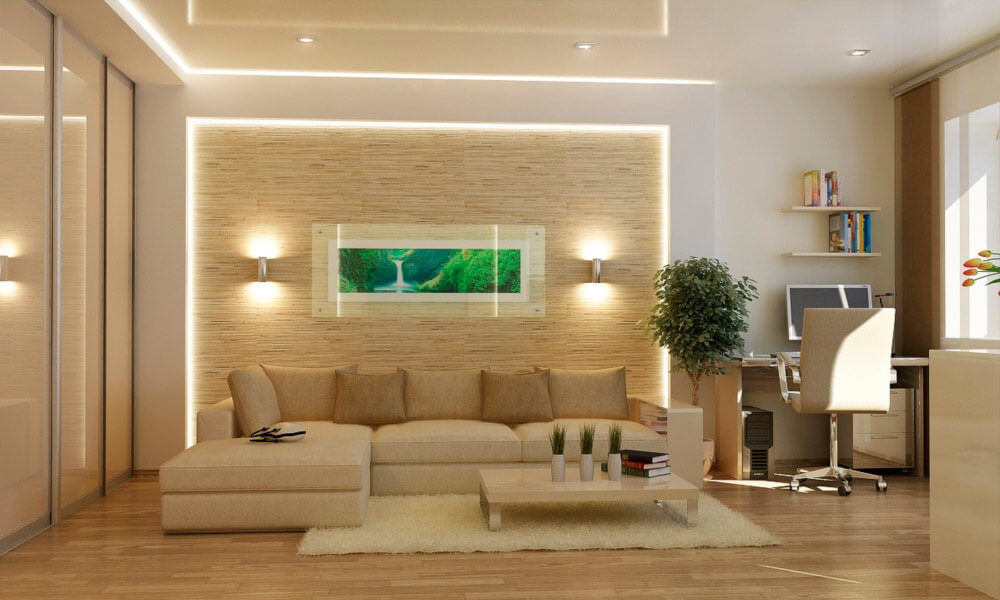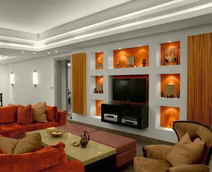 Plasterboard products can be attached to any wall and fit into any design. It is a mistaken opinion that they are relevant only in expensive luxury interiors. They can be used even in the most modest apartments. Competent design, color scheme, plus highlighting the dignity of the lights - and beautiful and unique living room design you provided.
