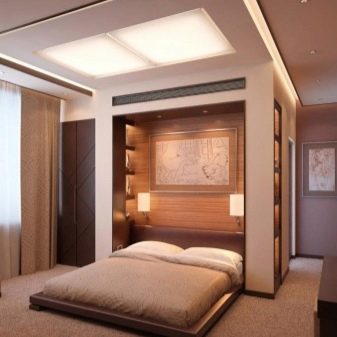 Placing the bed in the deepening of the living room, the owner of the room combined the bedroom and the living room. Having added an original curtain, we will receive a lonely and quiet place of rest.