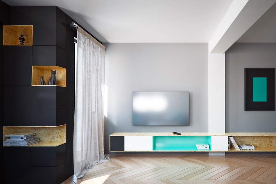 In this room, niches completely occupied one of the walls. Since the room is quite spacious, it was not planned to expand the space. Vertical grooves only emphasize the height of the ceilings. The central niche is used as a place for the TV, and the rest - as shelves for decorative elements. Glass inserts emphasize the modern style in which the living room is made. Designers used the same color for all walls. By adding a spotlight, they provided an emphasis on the necessary zones.
