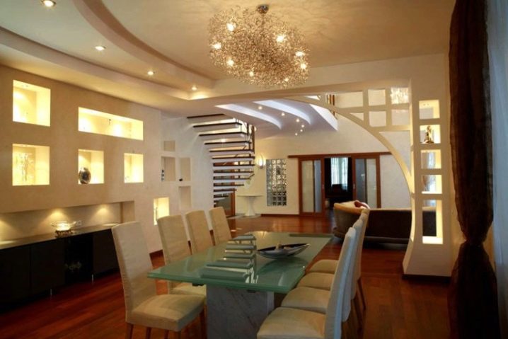 Without a doubt, plasterboard elements in the living room have a specific function - practical or decorative. And most often both at the same time. With this, they stand out as follows: