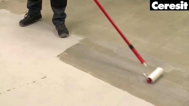 For the treatment of absorbent bases of the floor - concrete, fiberboard, gypsum fiber, gypsum screeds, anhydrite compounds and cement-sand mixtures, the most effective primer for mineral bases is Ceresit R 777. It reduces the absorption capacity, stimulates the spreading of mixtures over the surface and binds all dust. It can be used in interior decorating works only in heated premises.