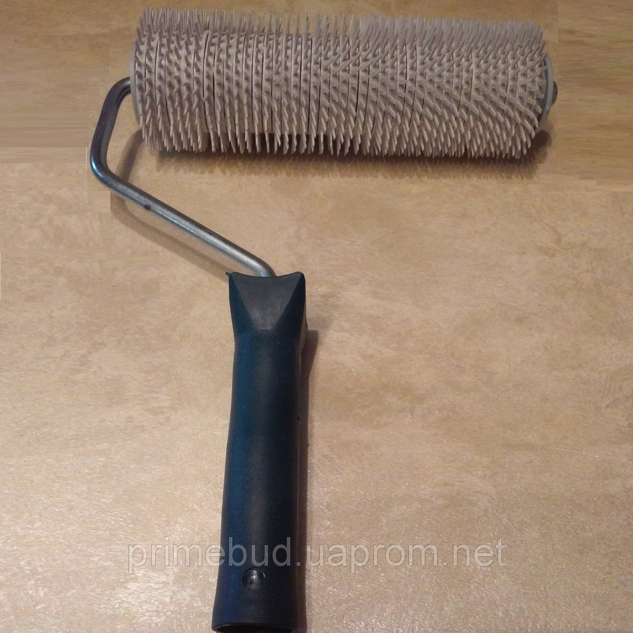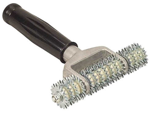 The photo shows a needle tool for drywall. His needles are steel and have the appearance of a cone. The handle is varnished, it is practical for durable use and a variety of manipulations. The width of the roller is 150 mm, which is convenient for applying notches on sheets of drywall. It is suitable for removing the wallpaper.