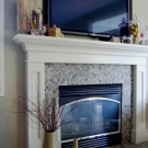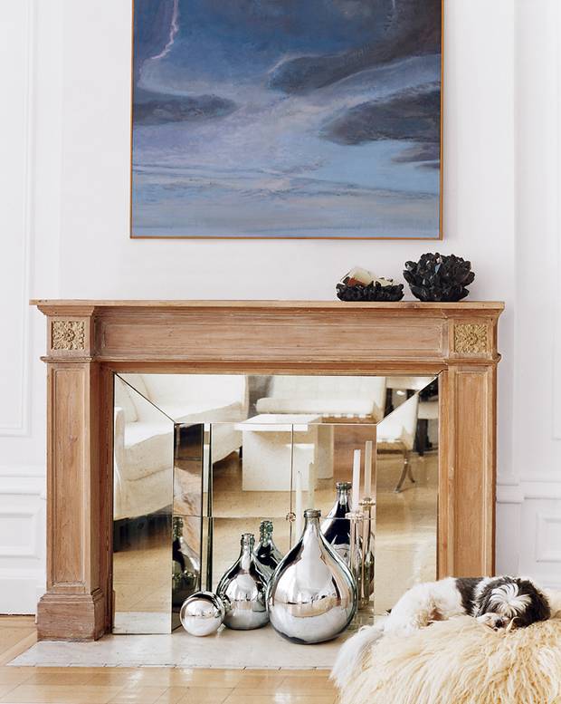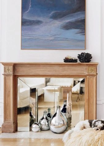 The modern look will emphasize the lonely vase or jug. In addition, it will give softness to the angular forms of the fireplace. It looks very unusual ornament of the mirror geometric shapes.