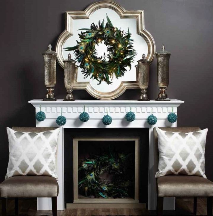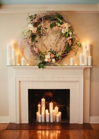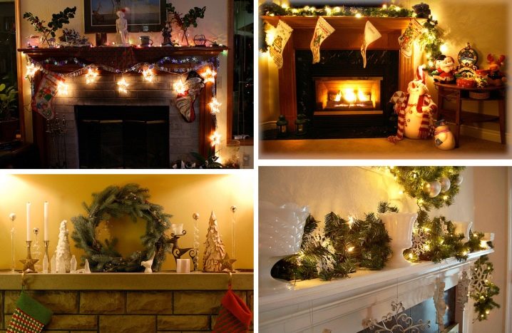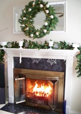 For the decoration of the fireplace for Christmas, the paws of coniferous trees are used, which are scattered around the mantel in a chaotic manner. They also make wreaths. The glitter and extravaganza of the holiday provide bright toys, tinsel, electric garlands, candles, citrus.