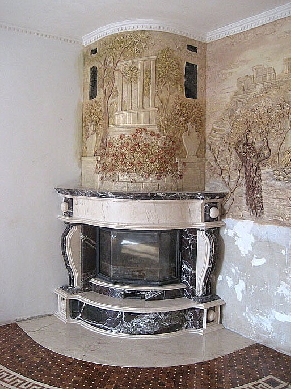 Clay tile, on which the patterns are stamped, is an ideal facing material for fireplaces. The material will not crack, crumble and perfectly retain the heat of the hearth for a long time. However, this process is quite time-consuming. After all, you need to stick each tile.
