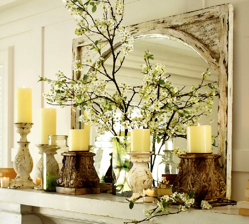 Bright yellow flowers and delicate branches of bushes against a white background of a fireplace give a very effective combination. Arrange them symmetrically on the mantelpiece in transparent vases. This technique will enliven the interior and fill it with positive.