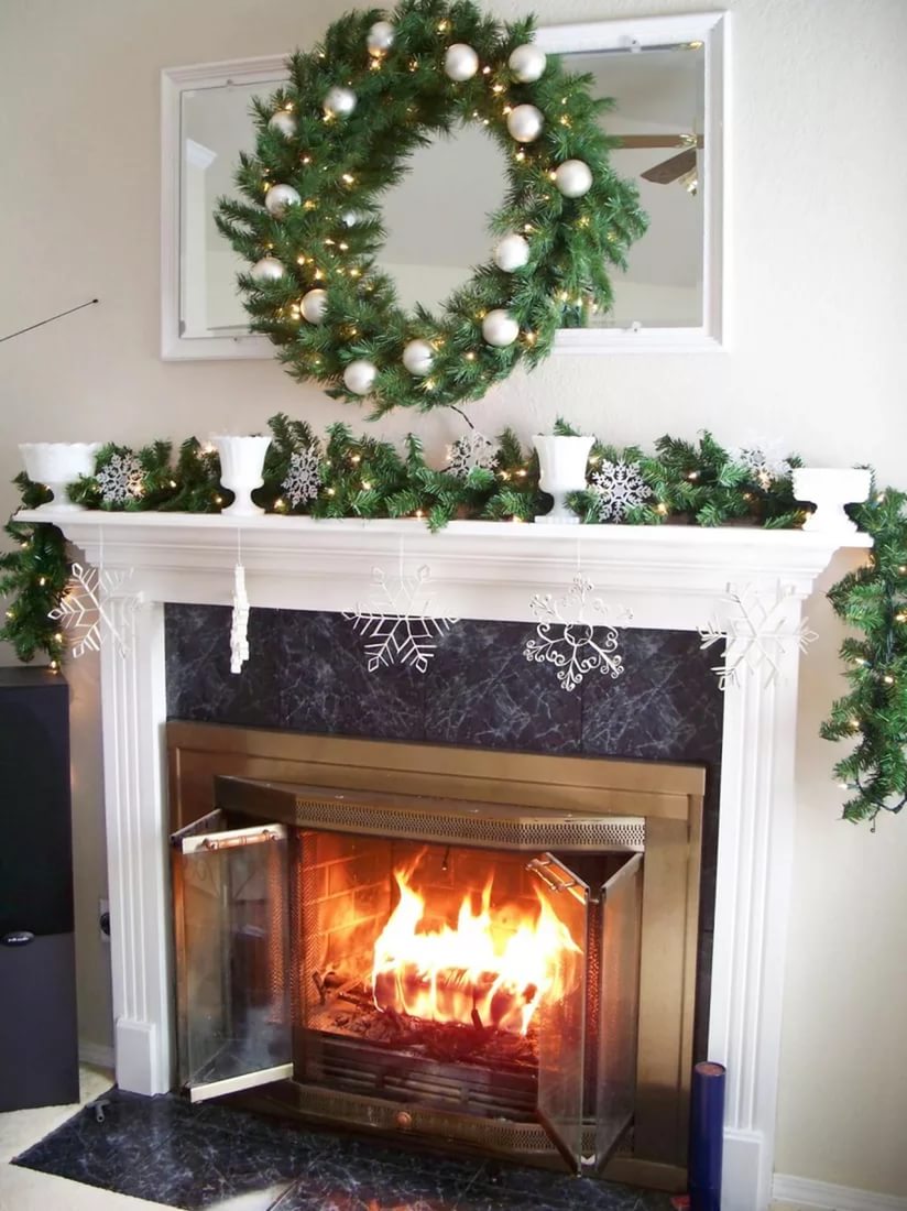 Silver stars look very nice and gentle, they are suspended above the hearth at different heights. Small Christmas trees in flower pots are also appropriate on the mantel.