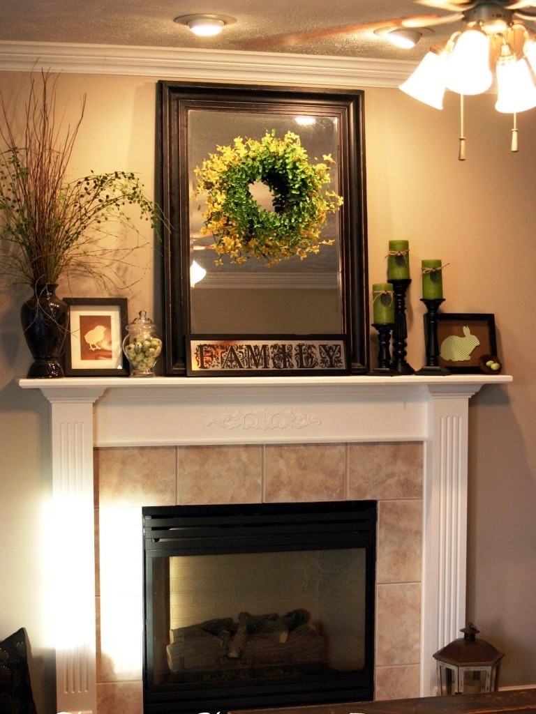 Decorating a spring fireplace is simple. To do this, you need primroses, greens and transparent vases (in the absence of the usual cans come down), which look easy, without overloading the interior. Imitation birdhouse of cardboard boxes would be very appropriate. This whole set is placed on the mantelpiece. You can hang a wreath of herbs on a colorful ribbon.