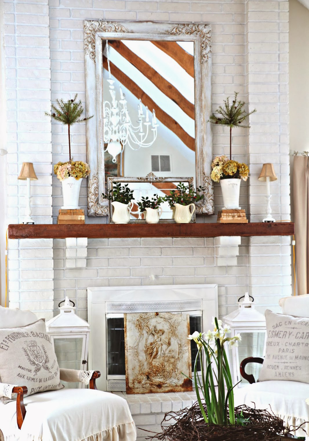 If you put a few white ceramic jugs on a mantelpiece, pots with a bright sprig of parsley, garden tools, you will get a magnificent spring composition in a rustic style.
