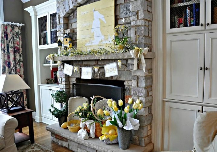 To decorate the fireplace for Easter, you will need spring greens, twigs, painted eggs, and Easter hares. You can hang a long garland of paper eggs or bright shreds of fabric.