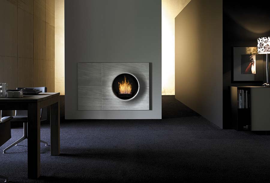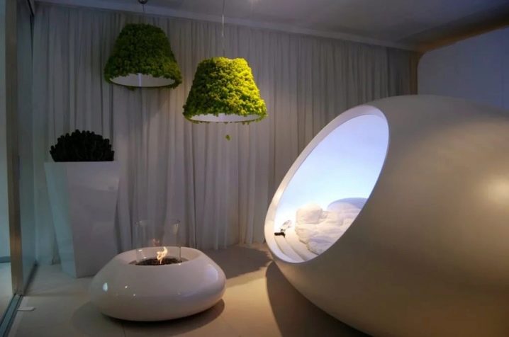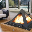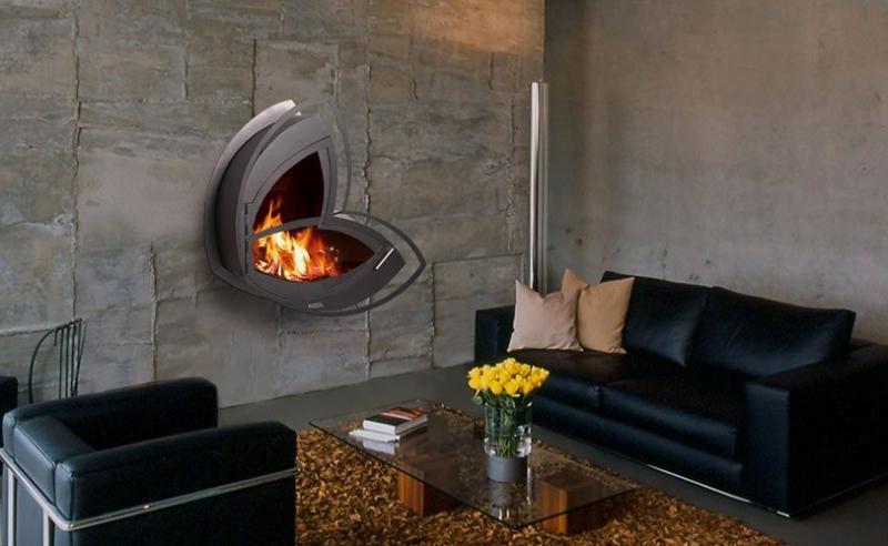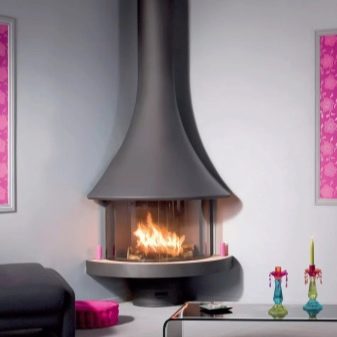 A bright prototype of high-tech style fireplaces are trilateral fireplaces. Popular today and round fireplaces in the form of an aquarium.The most original are the rotating models with a waterfall, performing the idea of romantics about the eternal observation of fire and streams of water.