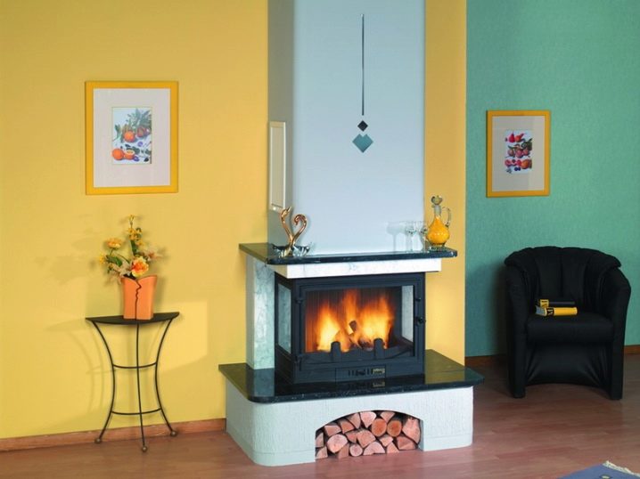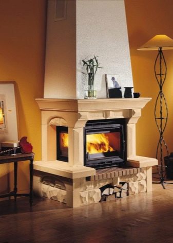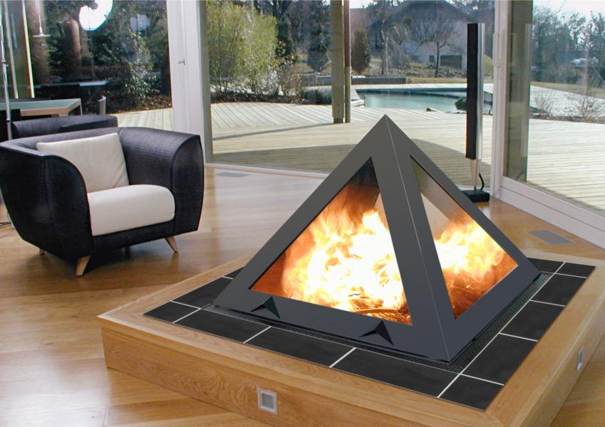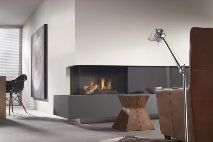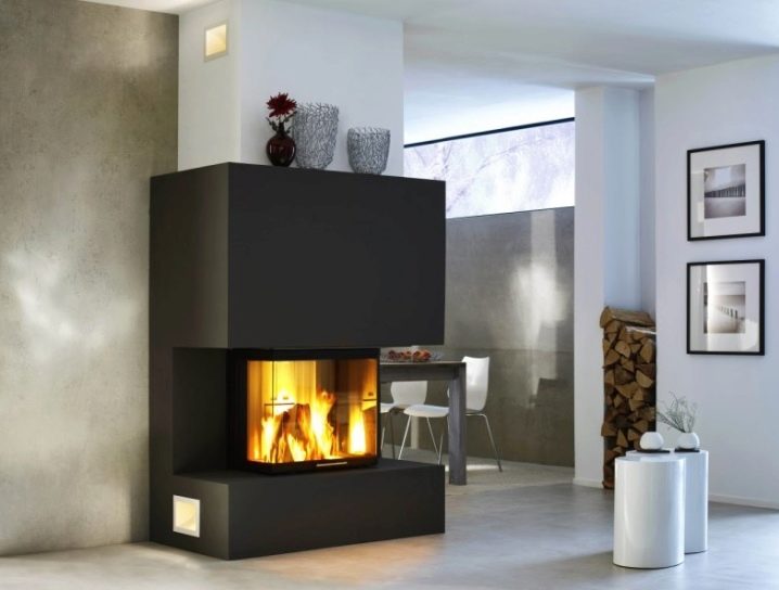In most cases, a false wall is used for the exterior of a three-sided fireplace. Less often you can see a similar model located in the center of the room. The forms of the fireplace are different. It can be a cube, a pyramid, a cylinder and other original variants.