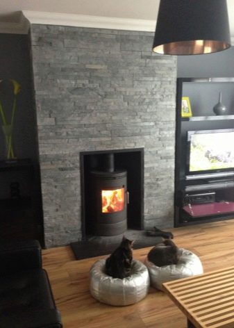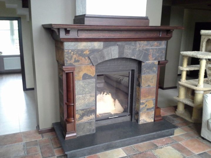 Natural material called "slate" is relevant for finishing real and artificial fireplaces. Its appearance is comparable in beauty with marble, because the composition of this stone is unique. Quartz and mica included in the material fill it with an amazing radiance, which is revealed when playing tongues of flame.