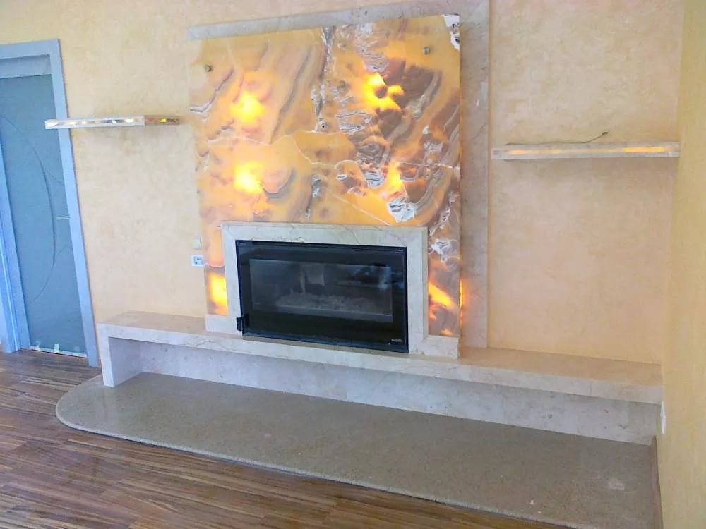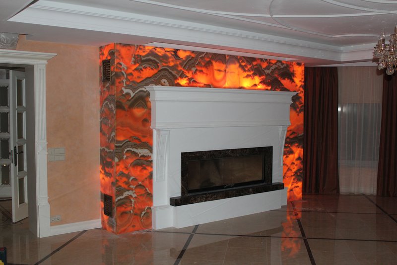 Another beautiful natural stone used to decorate the fireplace is onyx. It is impossible not to recognize him, because smooth transitions, stripes and spots, and besides, transparency belongs only to him - a stone worthy of admiration. It is the transparency of onyx that has become a fashionable trend in decorating the fireplace. Using the backlight of various colors helps to reveal the beauty of the material in all its breadth, however, onyx looks superb without such.