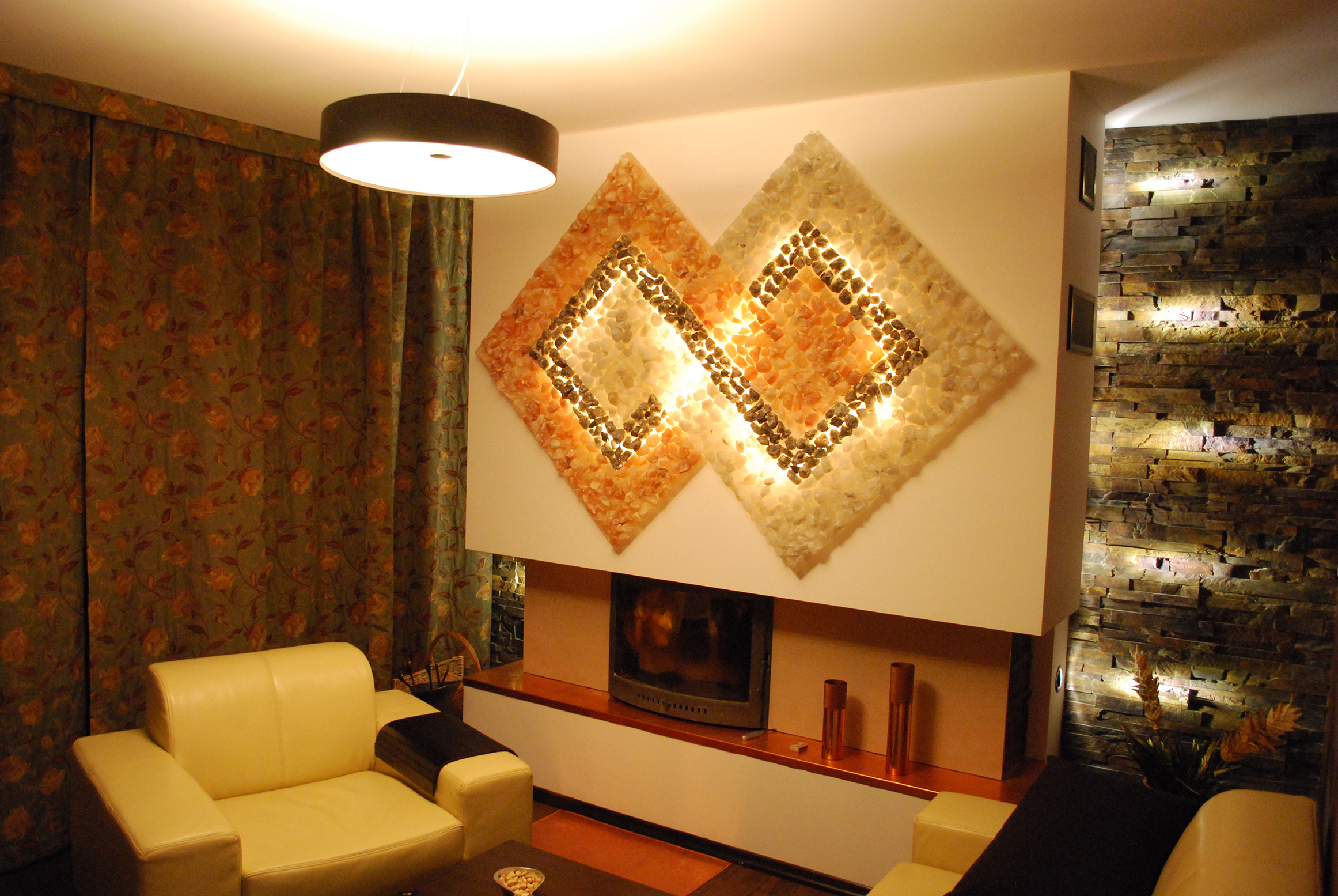 The effect of Himalayan salt is great, because it is not for nothing that salt caves and visiting them with the whole family is gaining all the great popularity. According to the owners of this unique material, colds and illnesses bypass the house, which means you can think about buying it. In the aesthetic sense, the crystals have a stylish radiance, which is perfectly emphasized by the flames, as well as additional lighting placed by the fireplace.