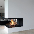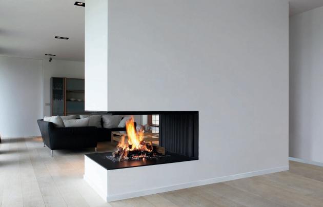 Another popular type of such fireplaces - the corner. Such models significantly save space, so if you have a small apartment or room, then it makes sense to take a closer look at the corner fireplaces. Such fireplaces, as well as closed, can be symmetrical or asymmetrical. Usually they are open from two sides.