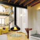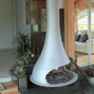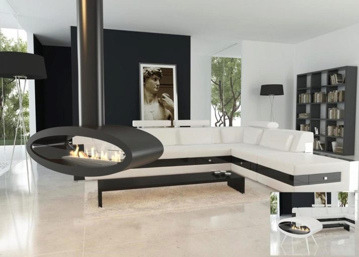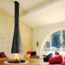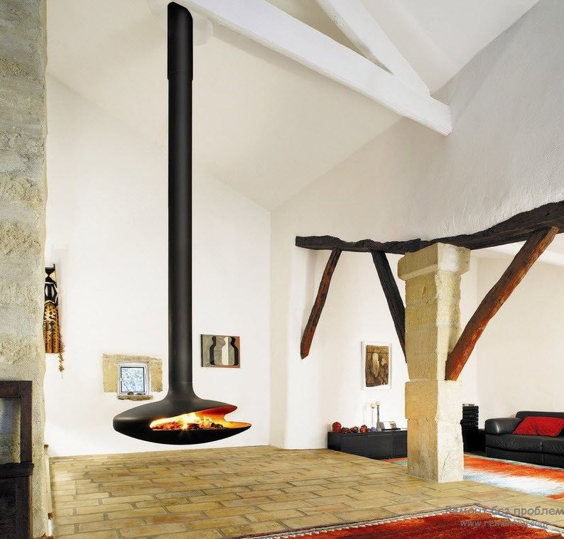 For lovers of original solutions in the interior is perfect for hanging fireplace. This unusual design, for all its non-standard, retained the functions of the hearth. The main part - a light metal body - is mounted to the ceiling or less often to the wall with a pipe. There are both solid fuel hanging fireplaces and biofireplaces. The disadvantages of such a device include low heat transfer, high cost and complexity of installation.