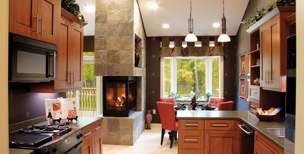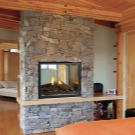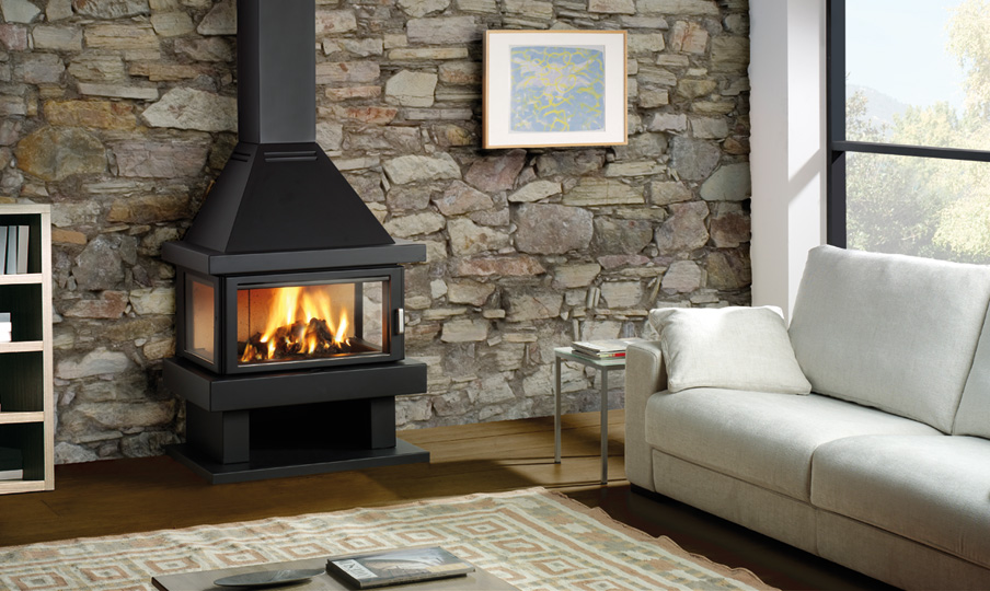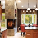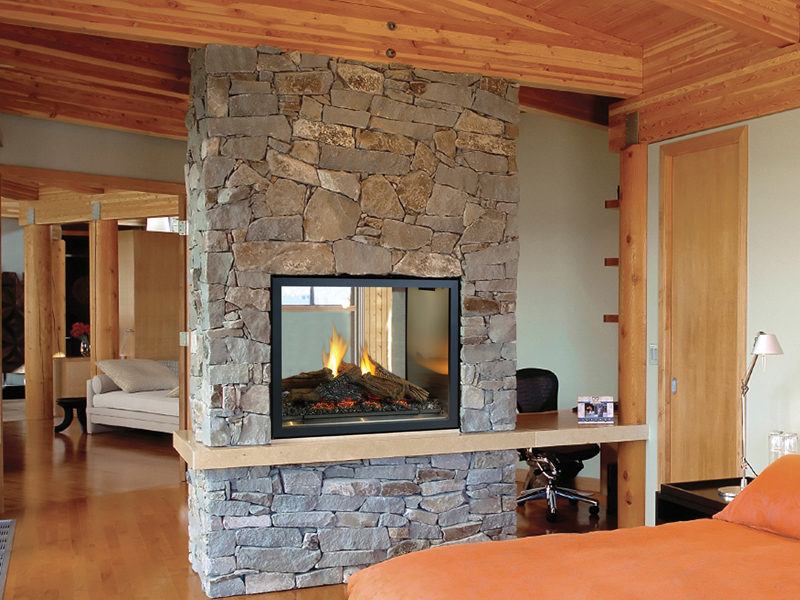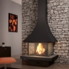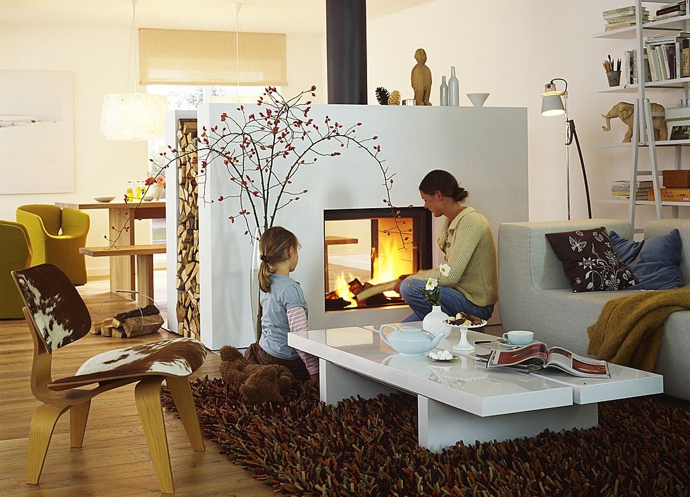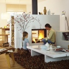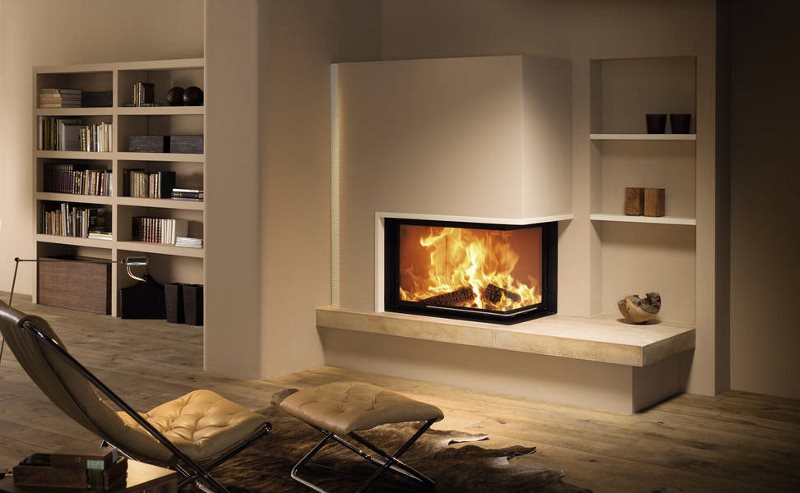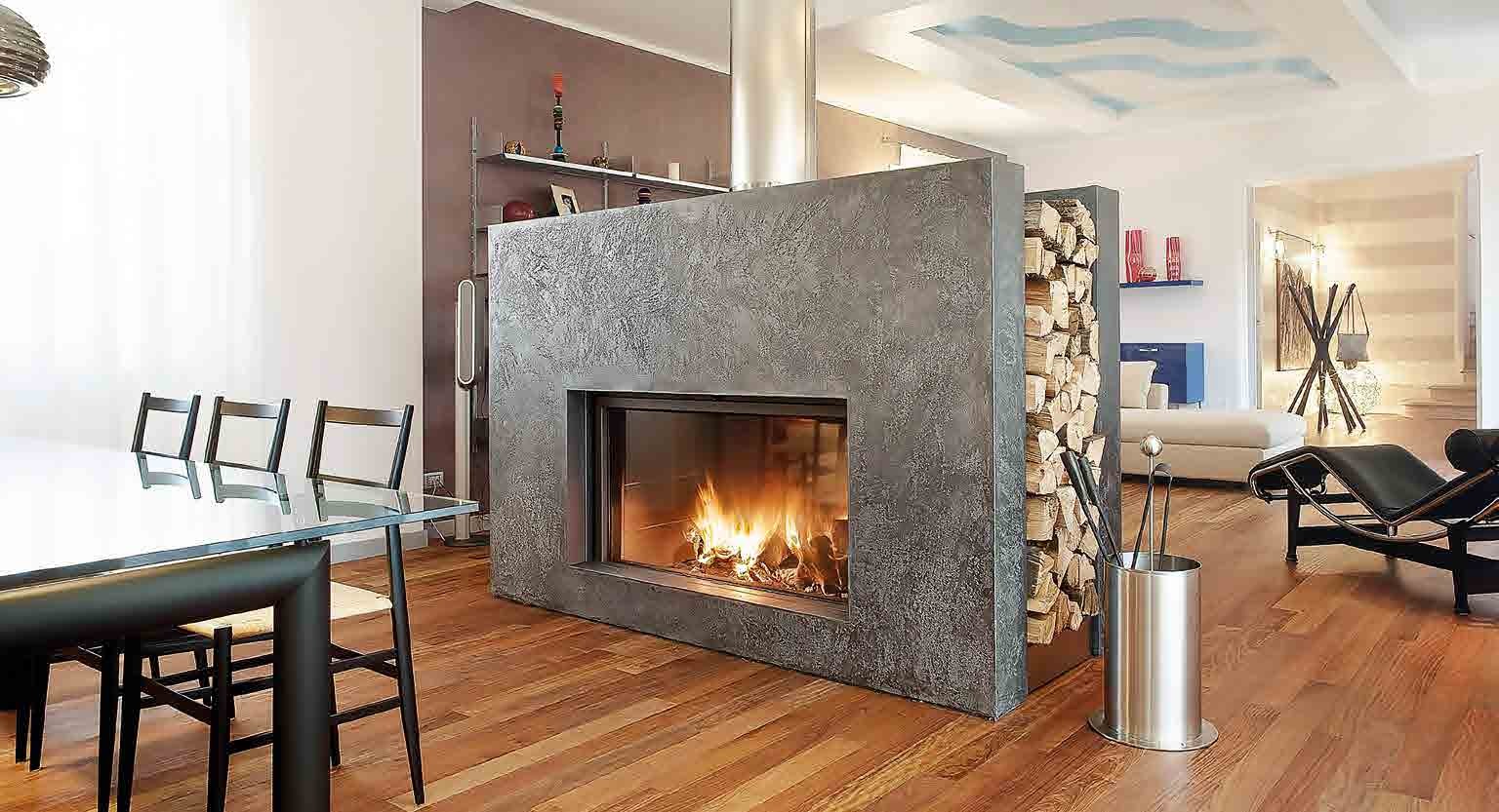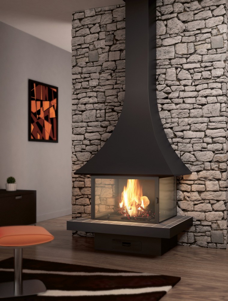 For heating a large room or for two adjacent rooms a double-sided fireplace is perfect. It is a through firebox with glass on both sides. Most often it is installed in a wall between two rooms, or in a decorative partition for zoning a room, which allows you to enjoy one fireplace in two different rooms.