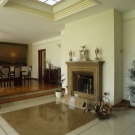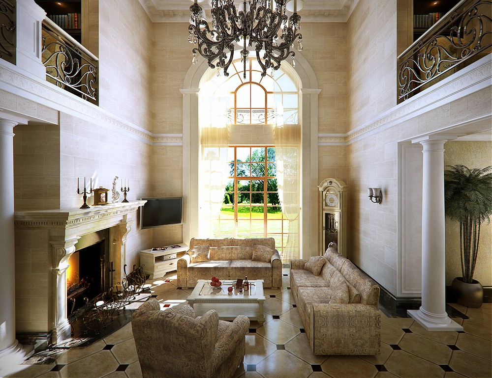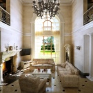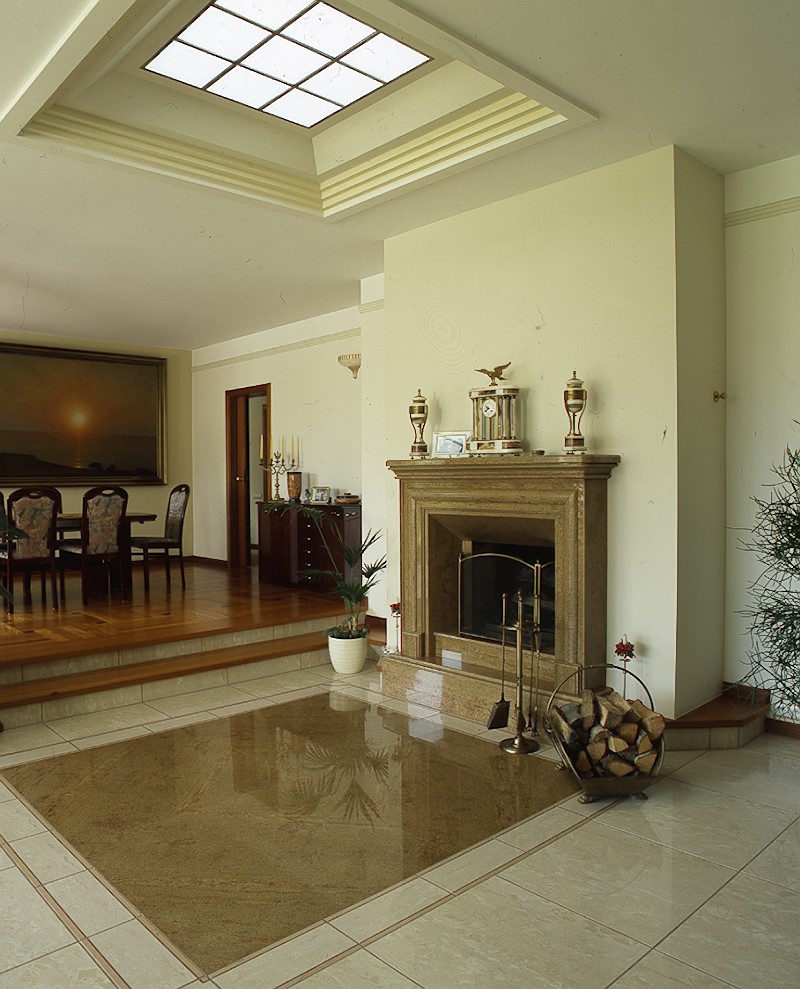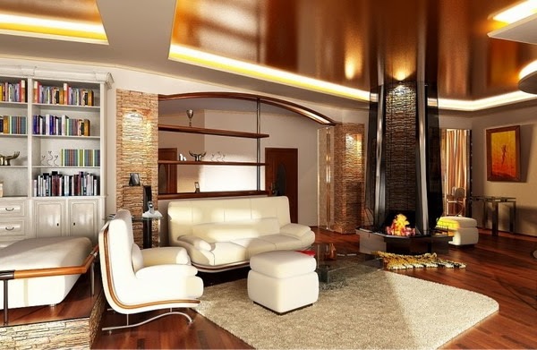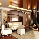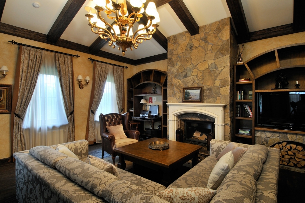 - For the fireplace, you can select a separate wall, lay it out with a stone and build in the hearth. This design will become the center of the living room. Tall windows will add light and space. Above the fireplace you can hang a picture, a family portrait or a TV.
