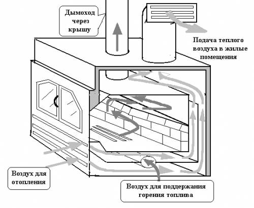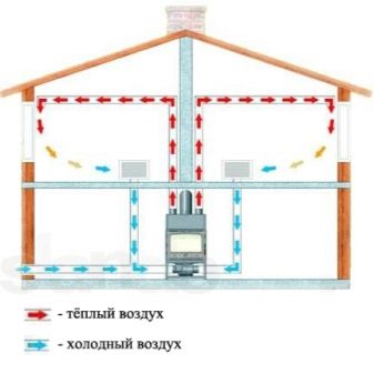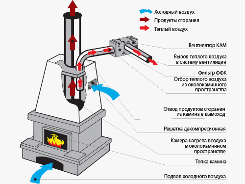 Additional air supply can provide a fan. It is installed in the vent of the fireplace. This device allows you to increase the rate of air circulation in the system. The streams pass through the pipes, get to the hearth, heat up, flow into the walls, the insulation box and the chimney. When enough warm air is collected, it enters the rooms through the ventilation grilles.