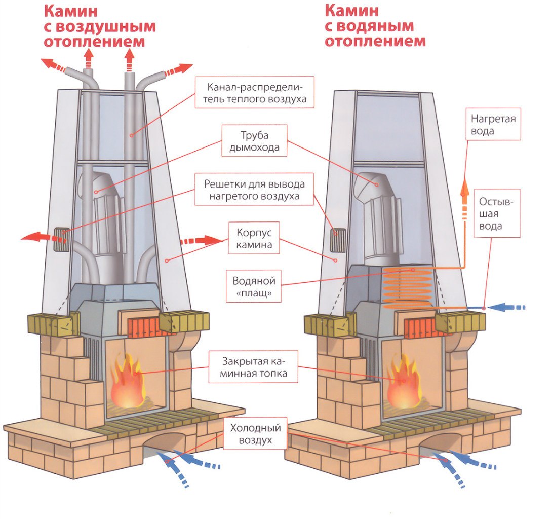 Dual heat transfer is the main feature of the fireplace with a water circuit; this is how it differs from air heating. The scheme of the heating process with the circulation of warm and cold air looks quite simple. The supply of cold air provides the flow of fluids into the fireplace through the pipes. The flow should be constant for high-quality heating; air intake occurs from the street or from the rooms. For this purpose, a fence system leaves the subfield.