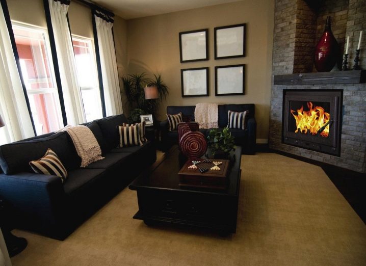 - The corner fireplace will gather a warm friendly company from its fire. On the contrary, you can put a chair or sofa. A small coffee table fits in perfectly. To create a more romantic atmosphere in front of the hearth, you can lay a soft carpet.