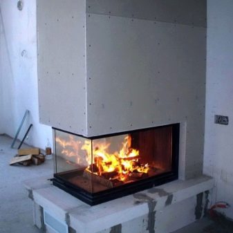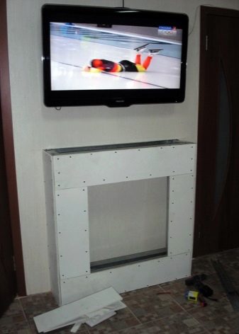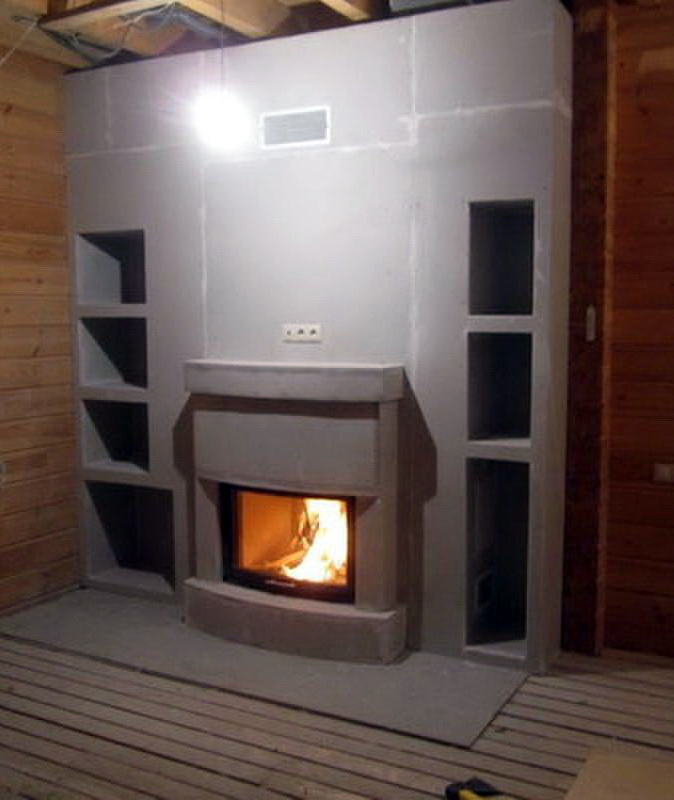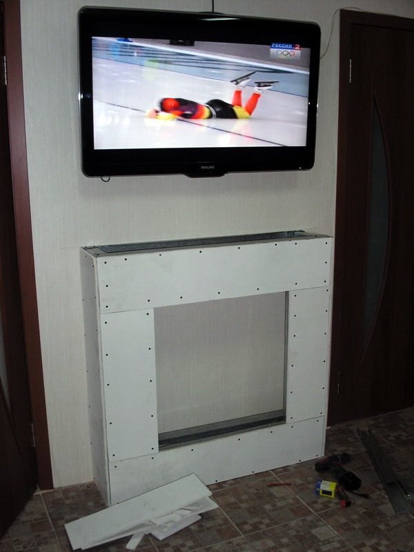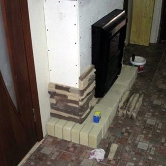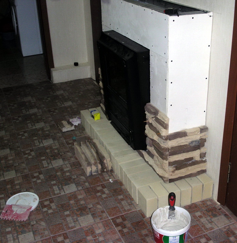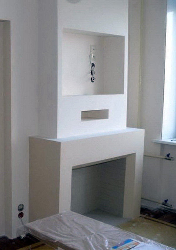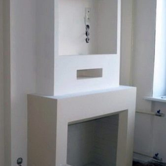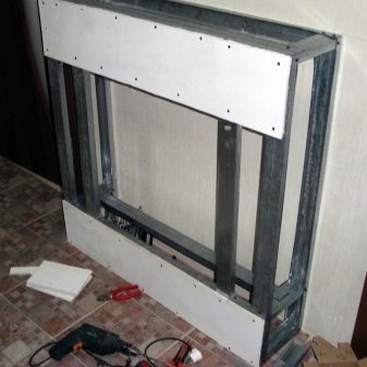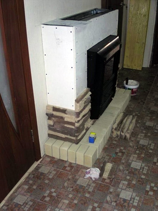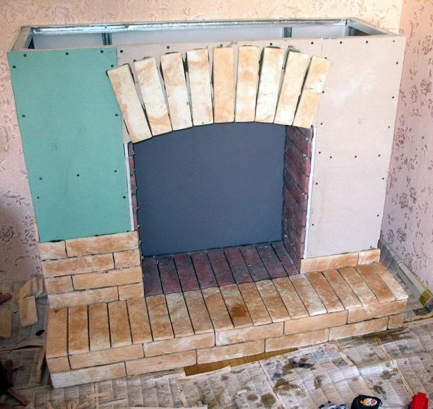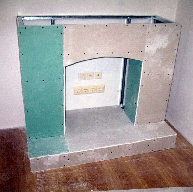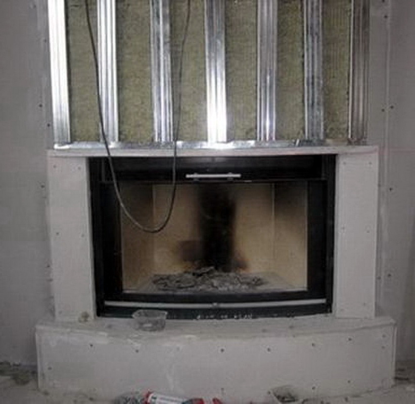 Cover the hull of the portal with plasterboard sheets and reinforce it with special building corners. On the resulting object, putty and decorate the fireplace as you see fit. At the final stage, place an electric fireplace in the finished structure.