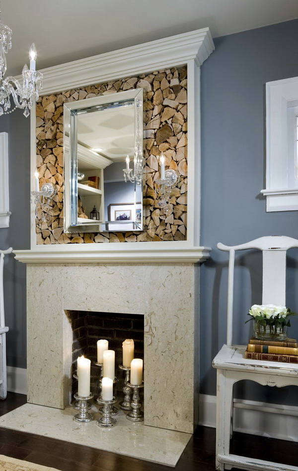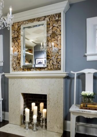Inside this design, to complete the picture, create an imitation of the hearth. A good option is to install instead of the back wall of the mirror. When using candles in the firebox of the fireplace, the mirror will give an unusual visual effect - create the depth of the imitation fire.