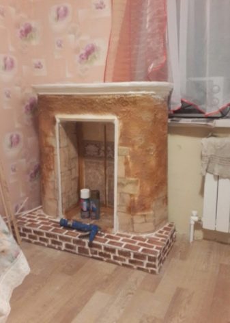 Some people decide to make a fireplace from an ordinary box from under household appliances and glue the design with wallpaper, while others prefer to use foam plastic based on cardboard and decorate their creation with shelves and candles on batteries.