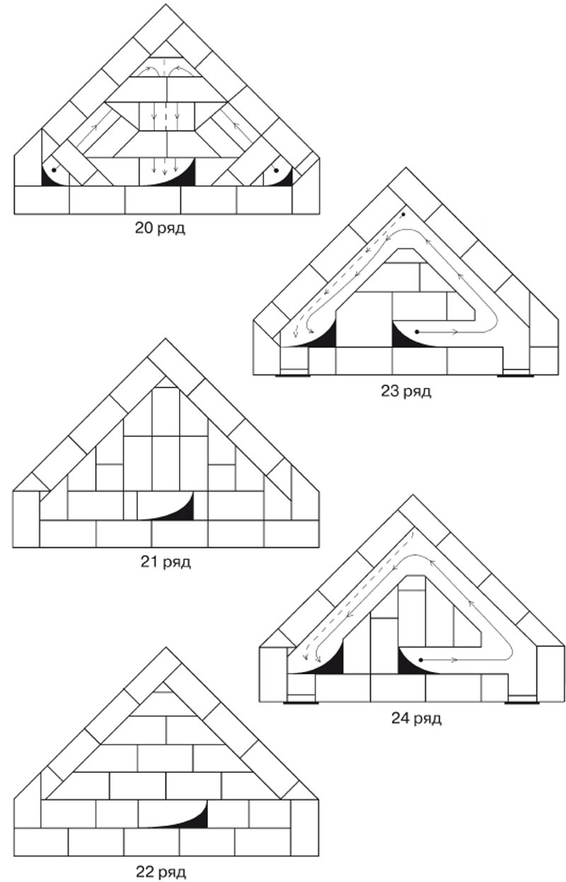 - The next two layers should narrow the firebox by pushing the bricks forward a little. On the 21st and 23rd rows, a kiln tooth with a projection of 20 degrees will form.