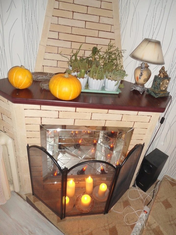As a decoration, you can use the screen on which there is an image of the flame. Some people buy special expensive devices that allow you to simulate the flames and the sound of crackling firewood.