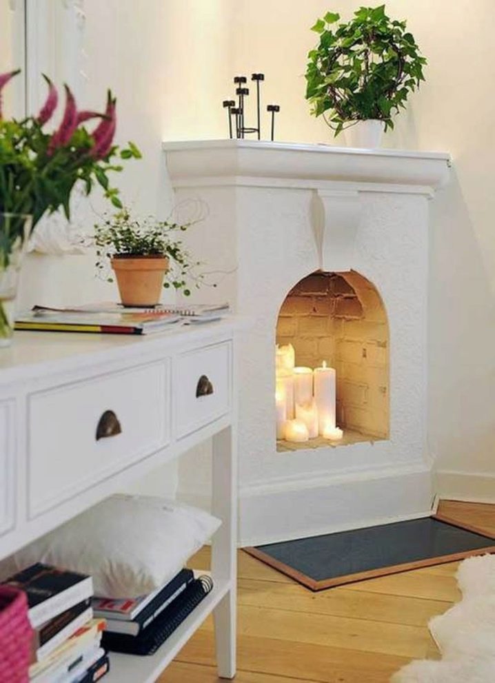 Decorative fireplaces are popular among residents of apartment buildings. The design is a model of a traditional portal, which can be made of any material: from boxes, cardboard, plywood, foam plastic and drywall. Imitation of fire creates a cozy and warm atmosphere.
