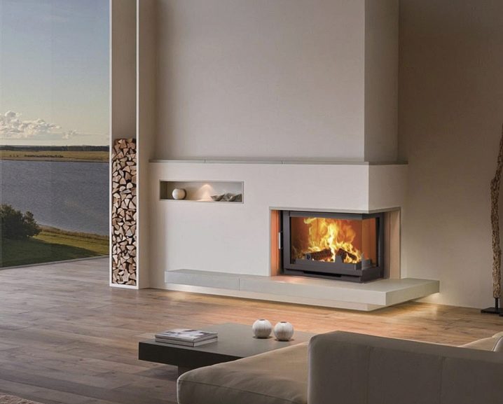Fireplaces can be arranged symmetrically or asymmetrically. For the latter option, you need to deploy a fireplace in the direction of the furniture.Asymmetrical designs have a rectangular shape that allows them to fit into the corner of the room.