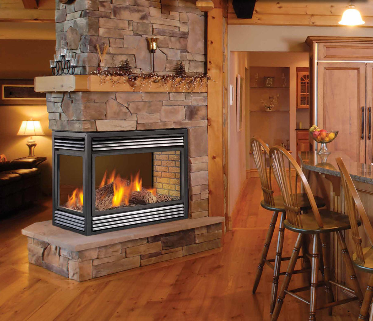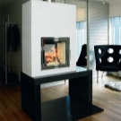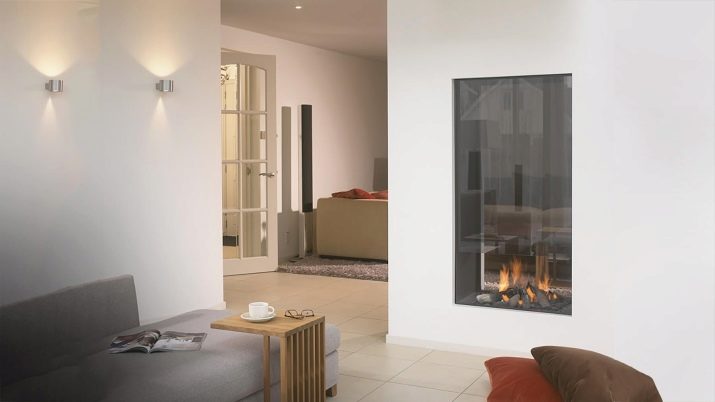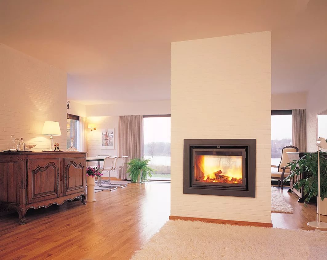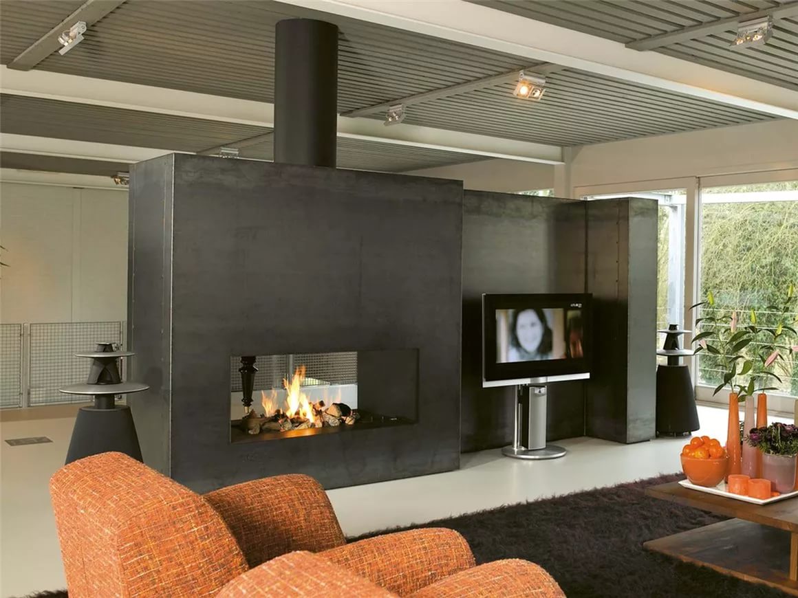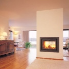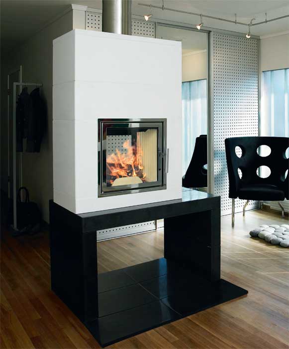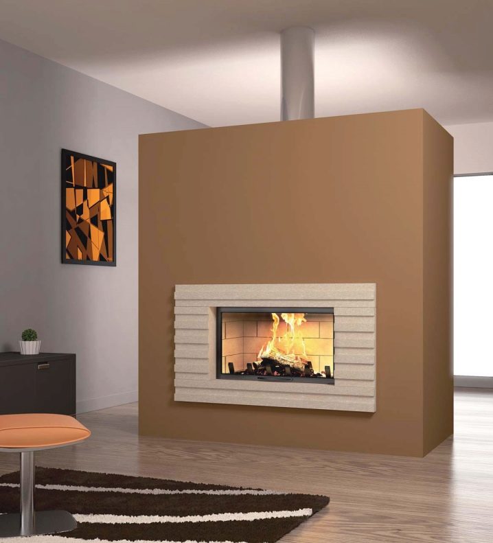 - One of the versions of the construction with a pipe is a double-sided fireplace. If the wall is not large enough to fit a fireplace insert into it, the back of the furnace protrudes from the wall, and it must somehow be further decorated - for example, to build additional partitions or a false wall. The main feature of this design is such that sometimes in this case they lay out the second fire chamber and a double-sided fireplace is obtained, which is able to heat two rooms at once.