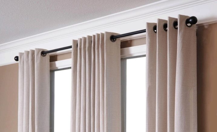 Another interesting move will be the use of a round base. It is made of a hollow tube, on which, just like in the previous case, the fabric is strung.The connecting element will be rings, which can both keep the canvas on clothespins, and be riveted into the fabric itself. These rivets are called grommets. The advantage here is the ease of movement without any hooks and braking. It is also easy to hang and remove. There are from one to three-row versions of such devices. This option is good for heavy curtains, but on the condition that the cornice is made of metal.