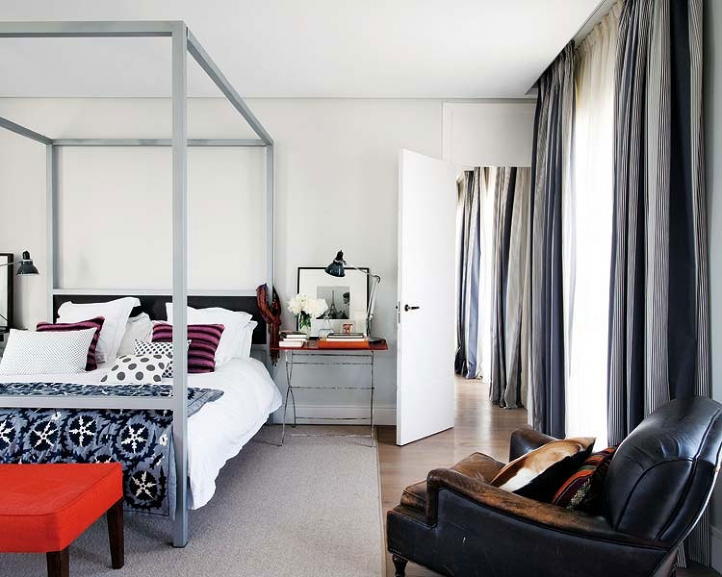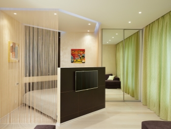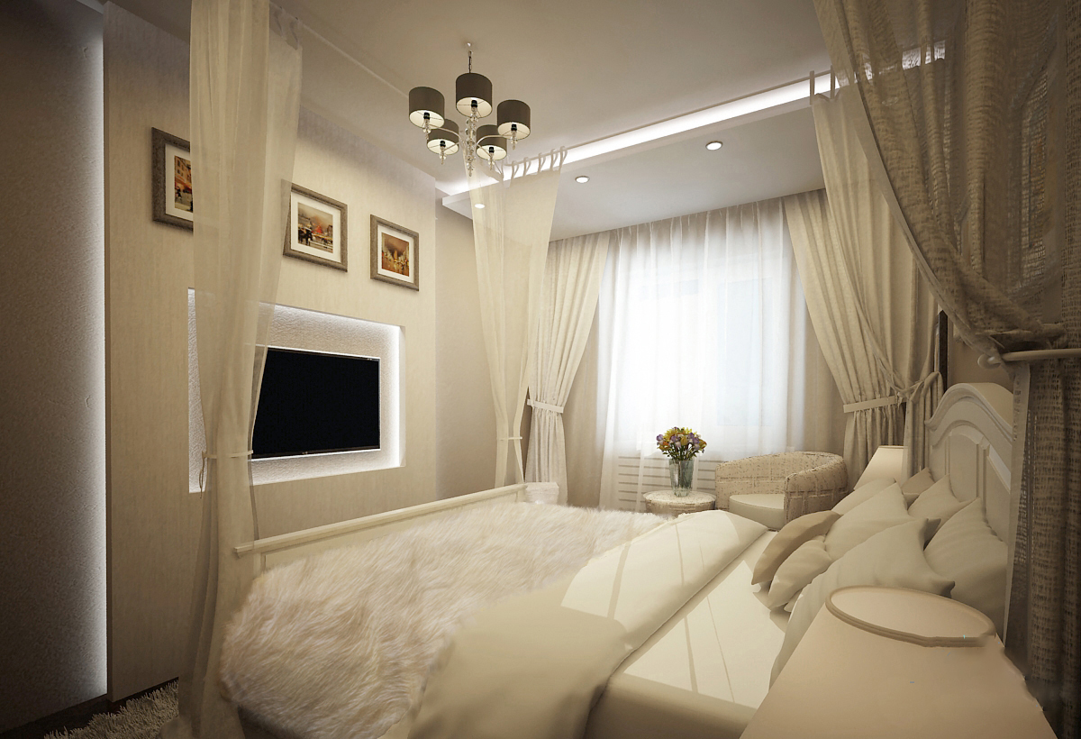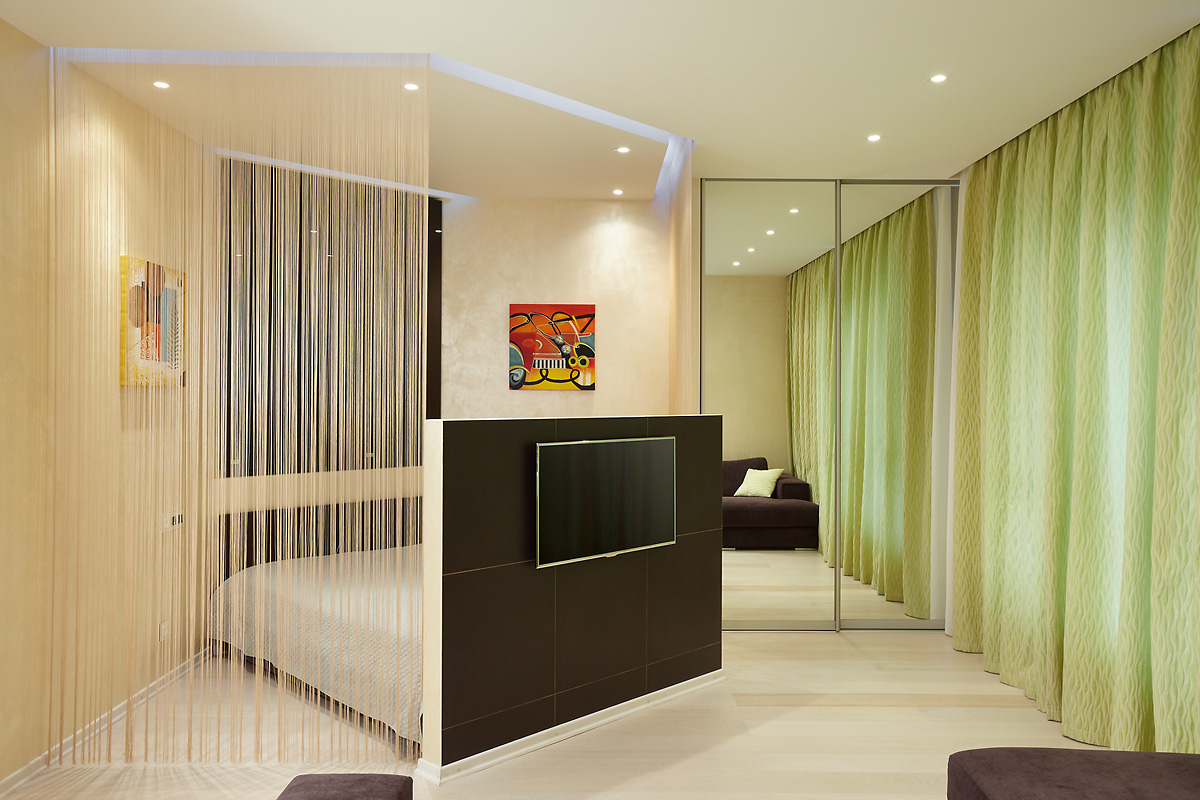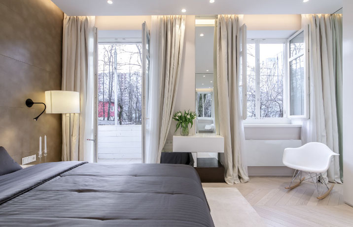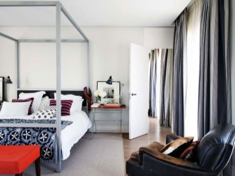 - space formation. The absence of any additional structures for fastening the curtains makes it possible not to distract attention from the atmosphere that the fabric flowing from the ceiling creates in the room;