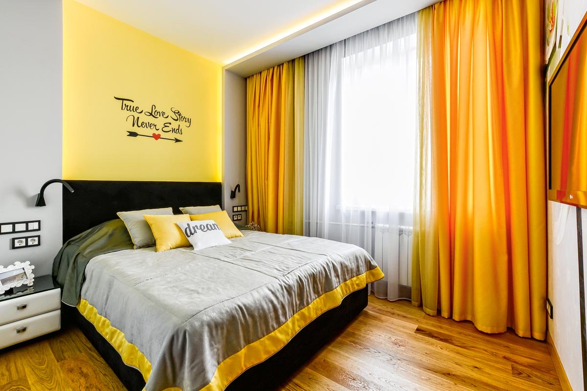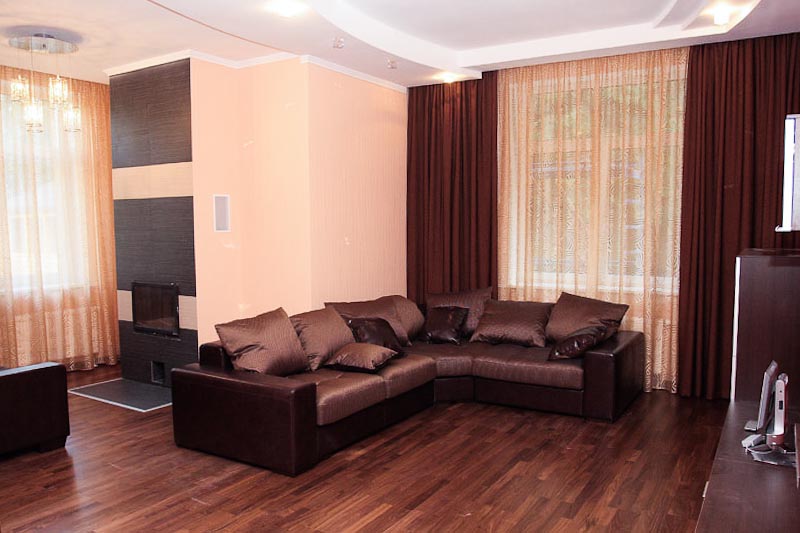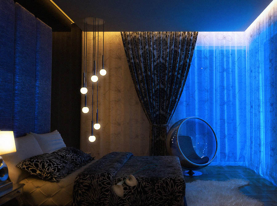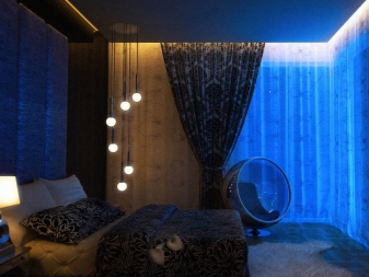If you want to highlight beautiful curtains as a dominant of the interior, use the lighting from under the niche of the hidden eaves. This is very effective and easy to do yourself. For such a backlight, a voltage of 12V is required, so a control unit must be installed.