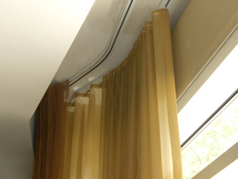 The line of curtains, due to the similar placement of the eaves increases, from this the room should seem wider. The openings of a particularly complex shape are formed by flexible eaves, and this applies not only to the window, but also used for zoning the space.