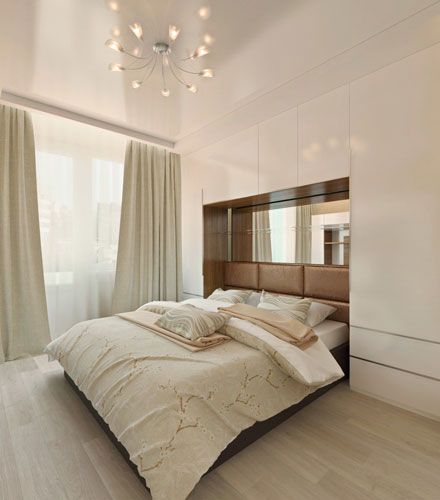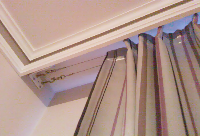 Invisible cornice will allow you to pay maximum attention to curtains, their texture, color. A small room will visually increase the hidden eaves across the entire width of the room.Such curtains look modern and add volume to the room.