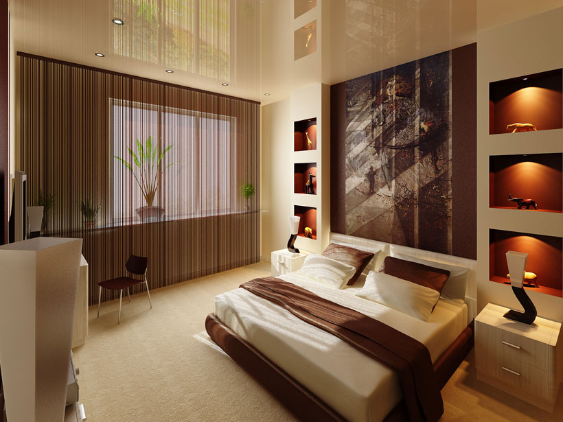 This design technique can successfully hide the cornice with the help of ceiling plinth. It allows you to close the line niche and give completeness of the room.