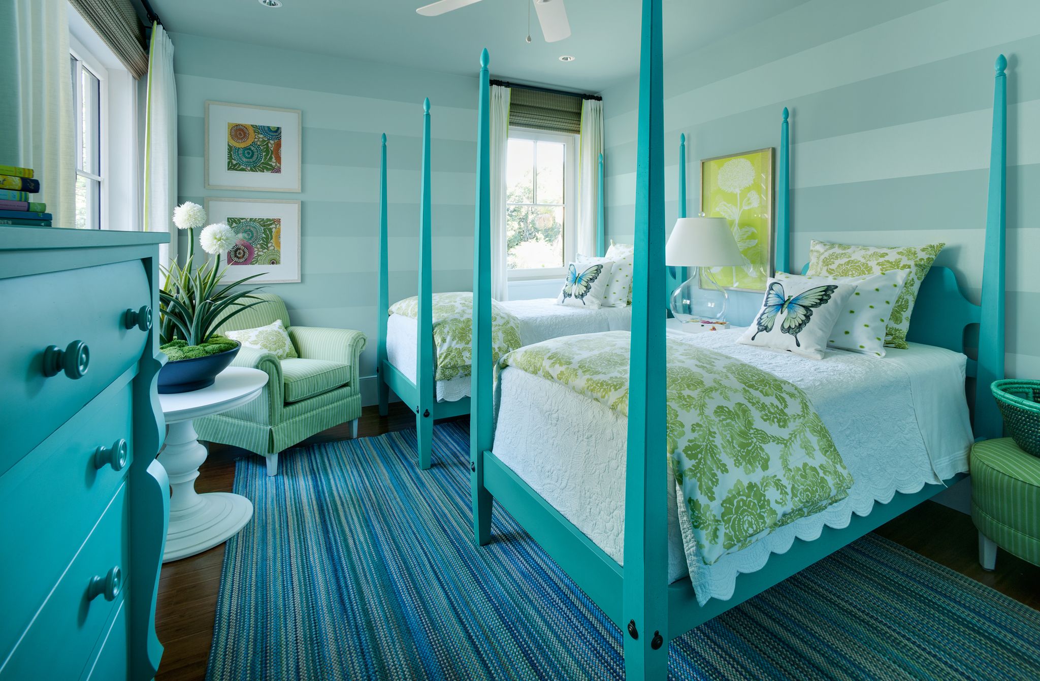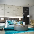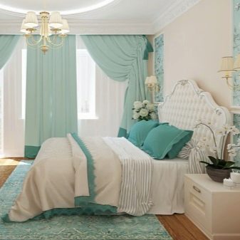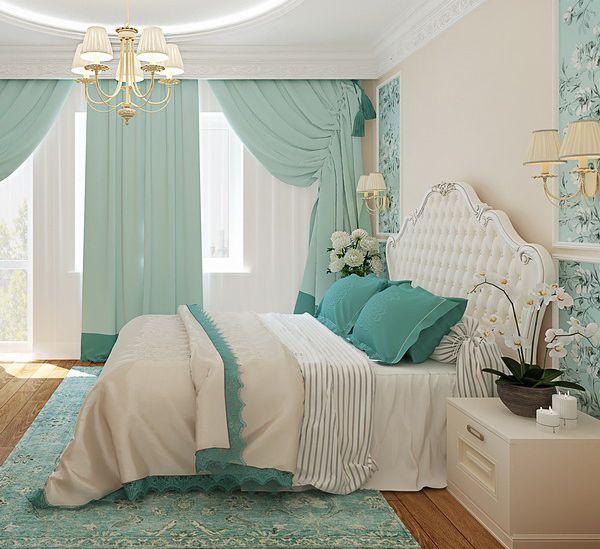 To create a spacious bedroom, consider combinations of white and turquoise. Even if you did not plan such a design, just add a bright turquoise carpet and a few trifles to the room. Your room will be completely transformed.